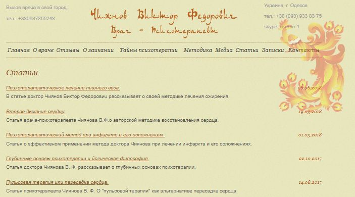 Известный врач-психотерапевт Чиянов Виктор Федорович участник передачи"Малахов плюс" успешно лечит невротические состояния у детей и взрослых. Разработанная доктором методика лечения позволяет избавляться от нервных состояний в любом возрасте начиная от самого раннего. За 35 лет работы врач избавил от нервных состояний несколько тысяч больных. Возможно приглашение доктора в свой город.
